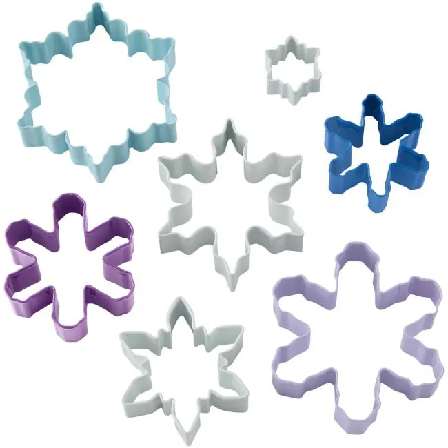 Dieses Set mit sieben Schneeflocken-Ausstechformen von Wilton ist ideal für winterliche Kekse! Die Ausstecher aus Metall haben unterschiedliche Designs, Größen und Farben