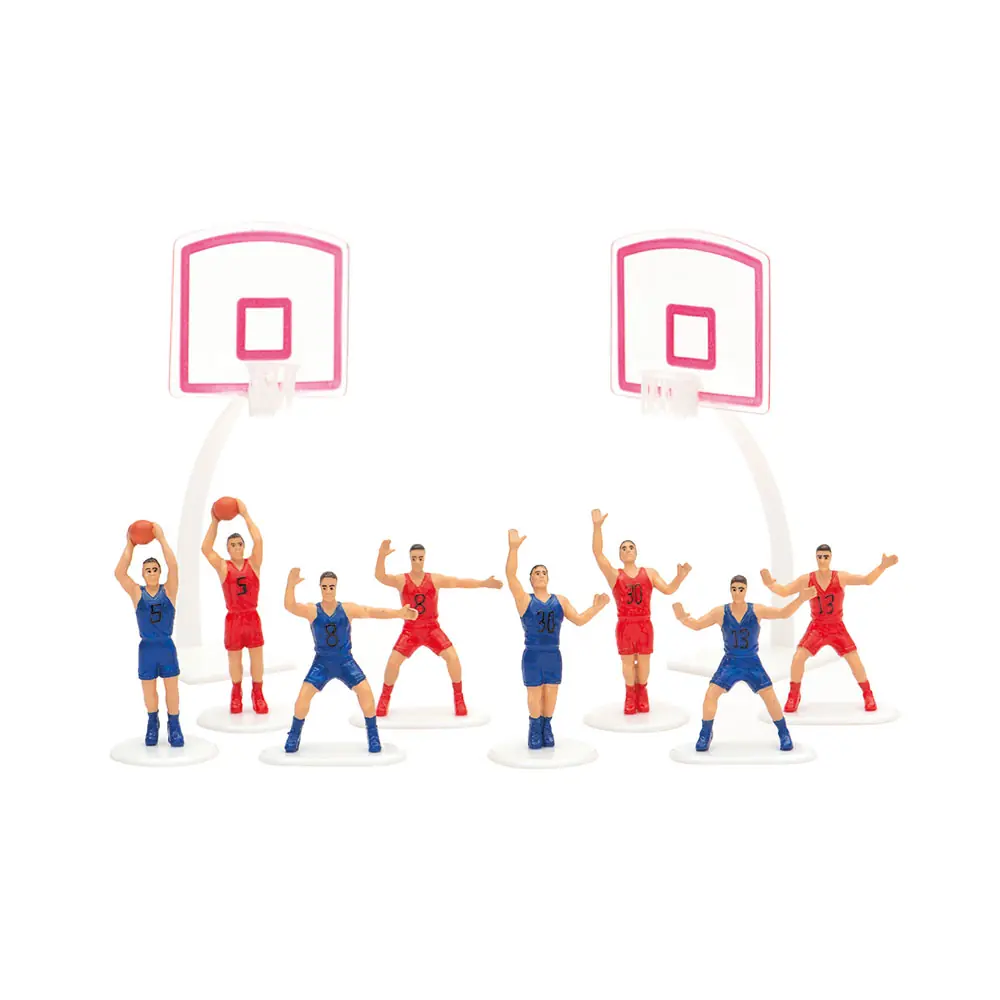 Deko-Set aus Kunststoff mit Basketballmotiv, perfekt zum Dekorieren von Torten. Das Kit enthält 8 Spieler und 2 Körbe