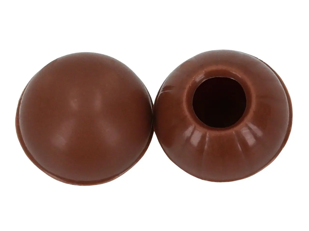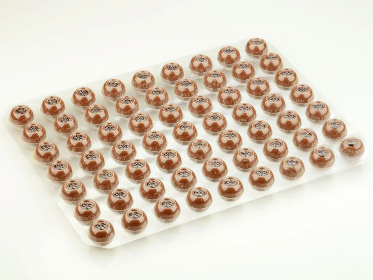 Jede Folie enthält 63 Hohlkörper, die sich perfekt für die Weiterverarbeitung eignen. Die Schokoladen-Hohlkugeln können einfach mit verschiedenen Pralinenmassen befüllt und anschließend mit temperierter Kuvertüre verschlossen werden.
