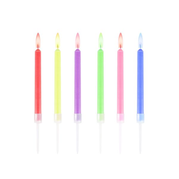 Geburtstagskerzen mit Flammen in Rot, Rosa, Lila, Blau, Grün und Gelb